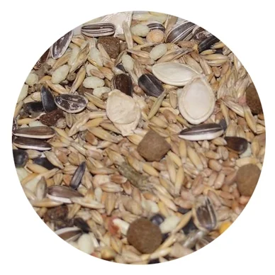Ингредиенты: травяные гранулы (злаковые культуры, клевер, вика, люцерна), комбикорм гранулированный (отруби пшеничные, льняное семя, костная мука, соль иодированная, дрожжи пивные и хлебные, витаминный комплекс), ячмень, овёс, пшеница, сушёные овощи, семена тыквы, льняное семя, семена бобовых растений, семя подсолнуха, кукурузные хлопья, сухие фрукты и овощи.