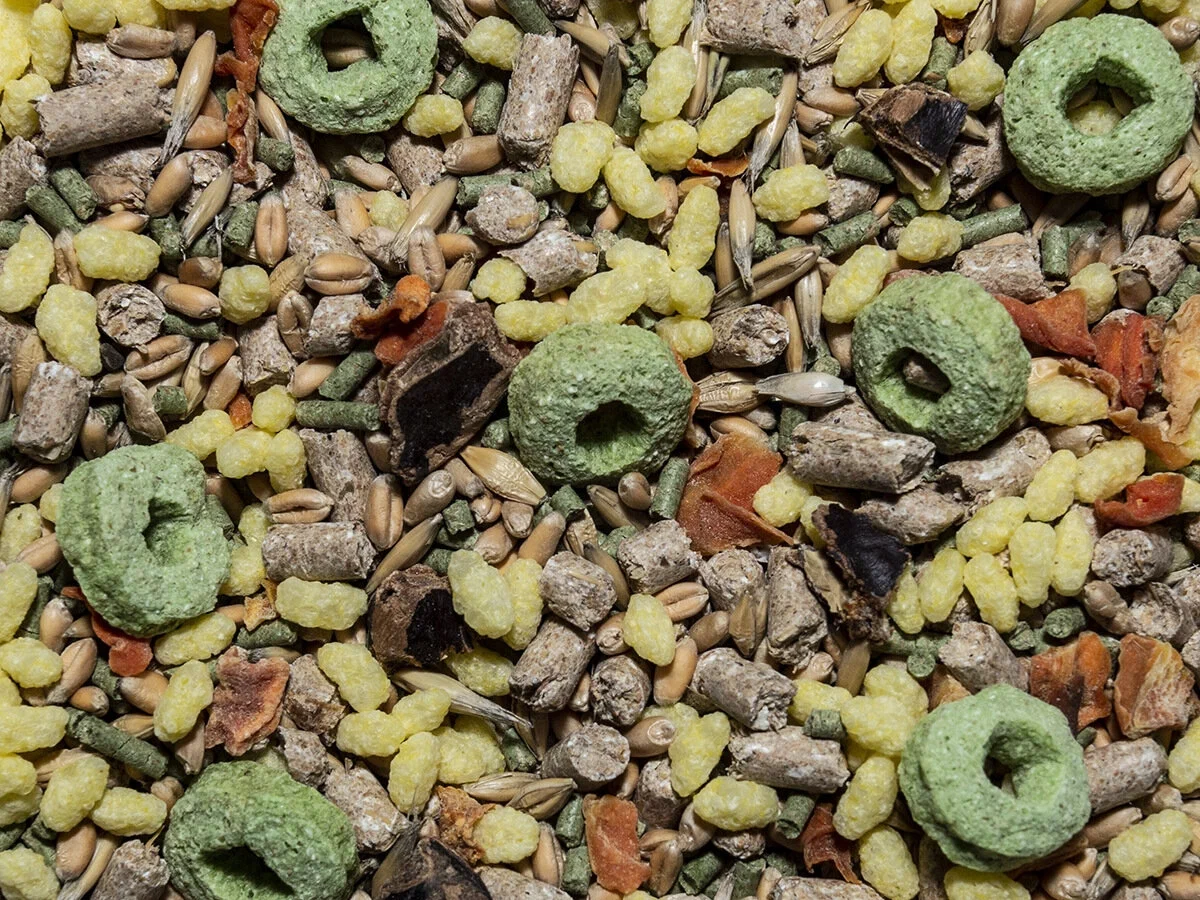 Состав: травяные гранулы (злаковые культуры, клевер, вика, люцерна), комбикорм гранулированный (отруби пшеничные, льняное семя, костная мука,соль йодированная, дрожжи пивные и хлебные, витаминный комплекс), пшеница, овес, ячмень, сушеные овощи, витаминизированное зерно, растительные хлопья (пшеничные, ржаные, кукурузные).