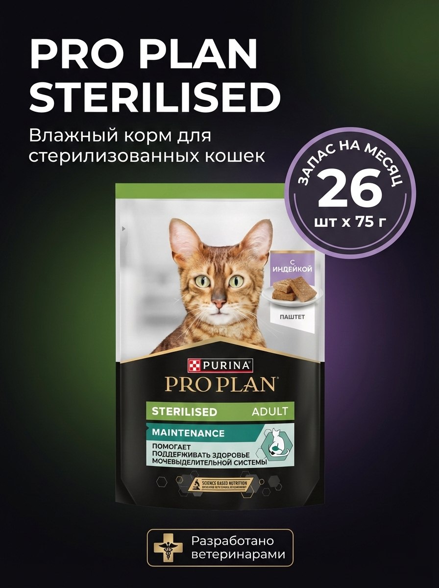 Влажный корм PRO PLAN для стерилизованных кошек Индейка паштет,  26x75г