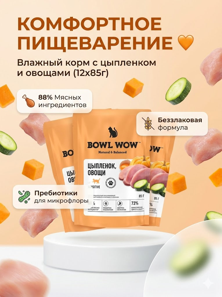 Влажный корм BOWL WOW для кошек с чувствительным пищеварением, с цыпленком и овощами 12х85 г