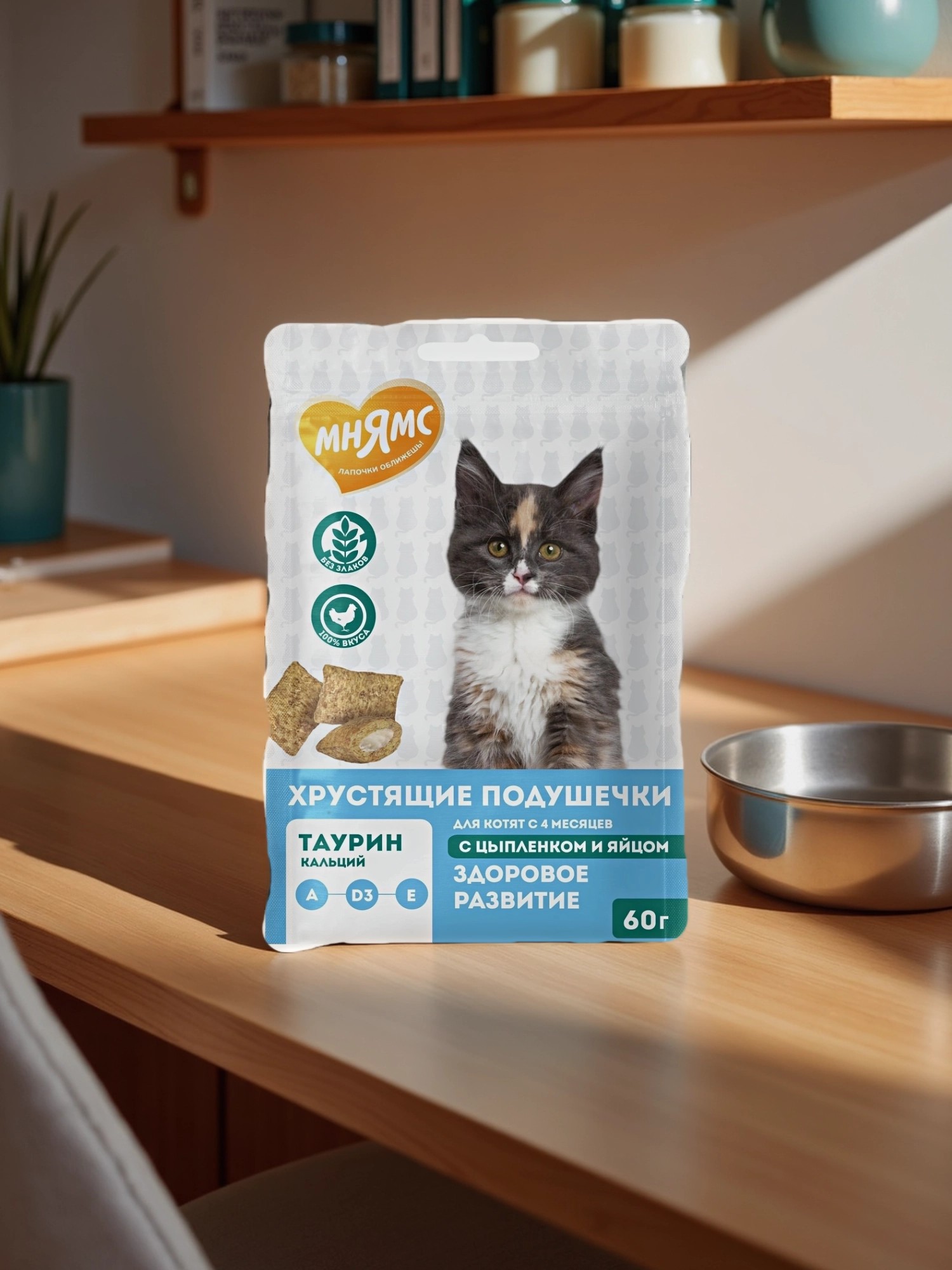 Лакомство Мнямс Хрустящие подушечки для котят с цыпленком и яйцом "Здоровый котенок" 60 г.