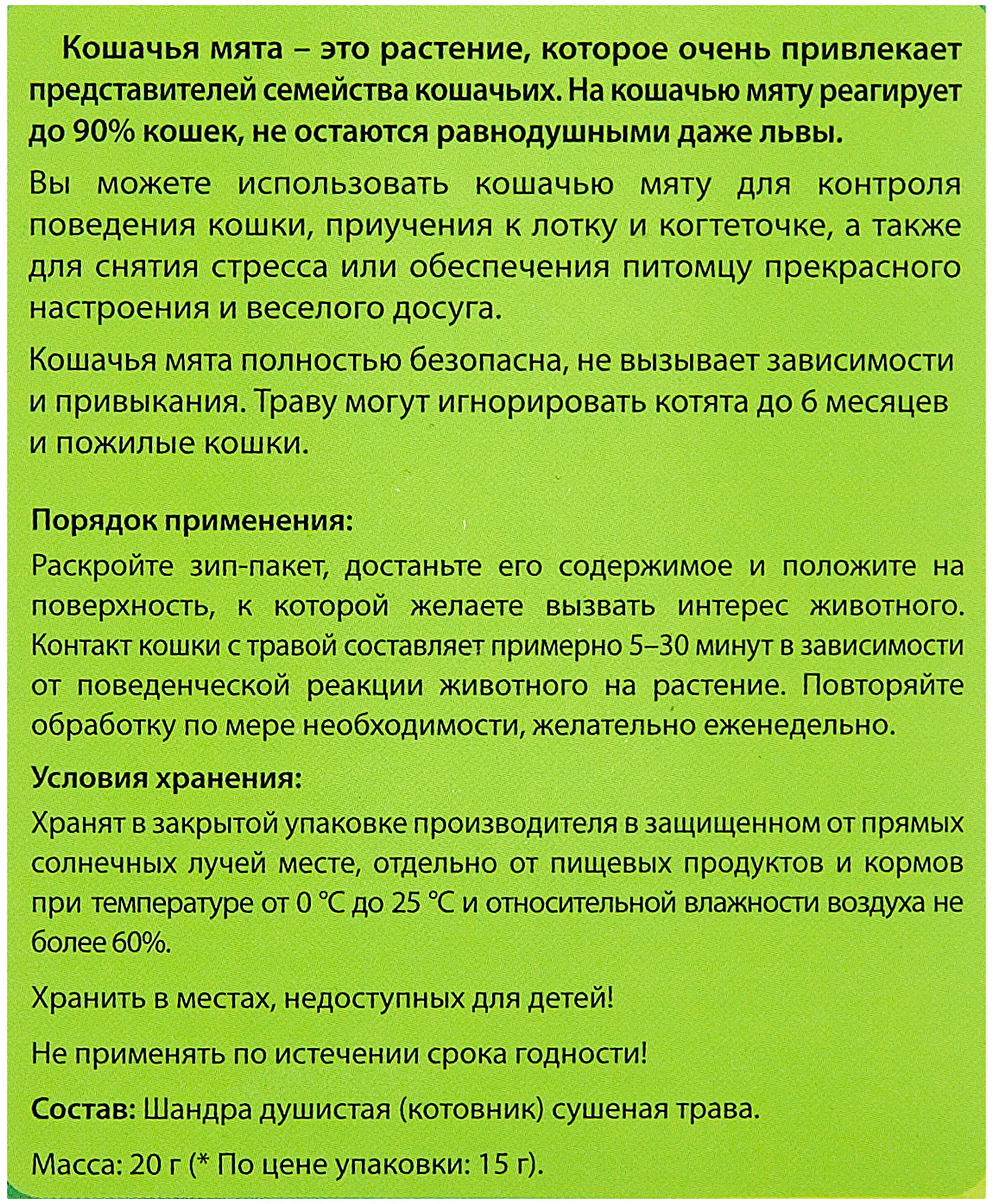 СПОСОБ ПРИМЕНЕНИЯ: Раскройте зип-пакетик, достаньте его содержимое и положите на поверхность, к которой желаете вызвать интерес. Контакт кошки с травой составляет, примерно, 5-30 минут в зависимости от поведенческой реакции животного на растение. Повторяйте обработку по мере необходимости, желательно еженедельно.