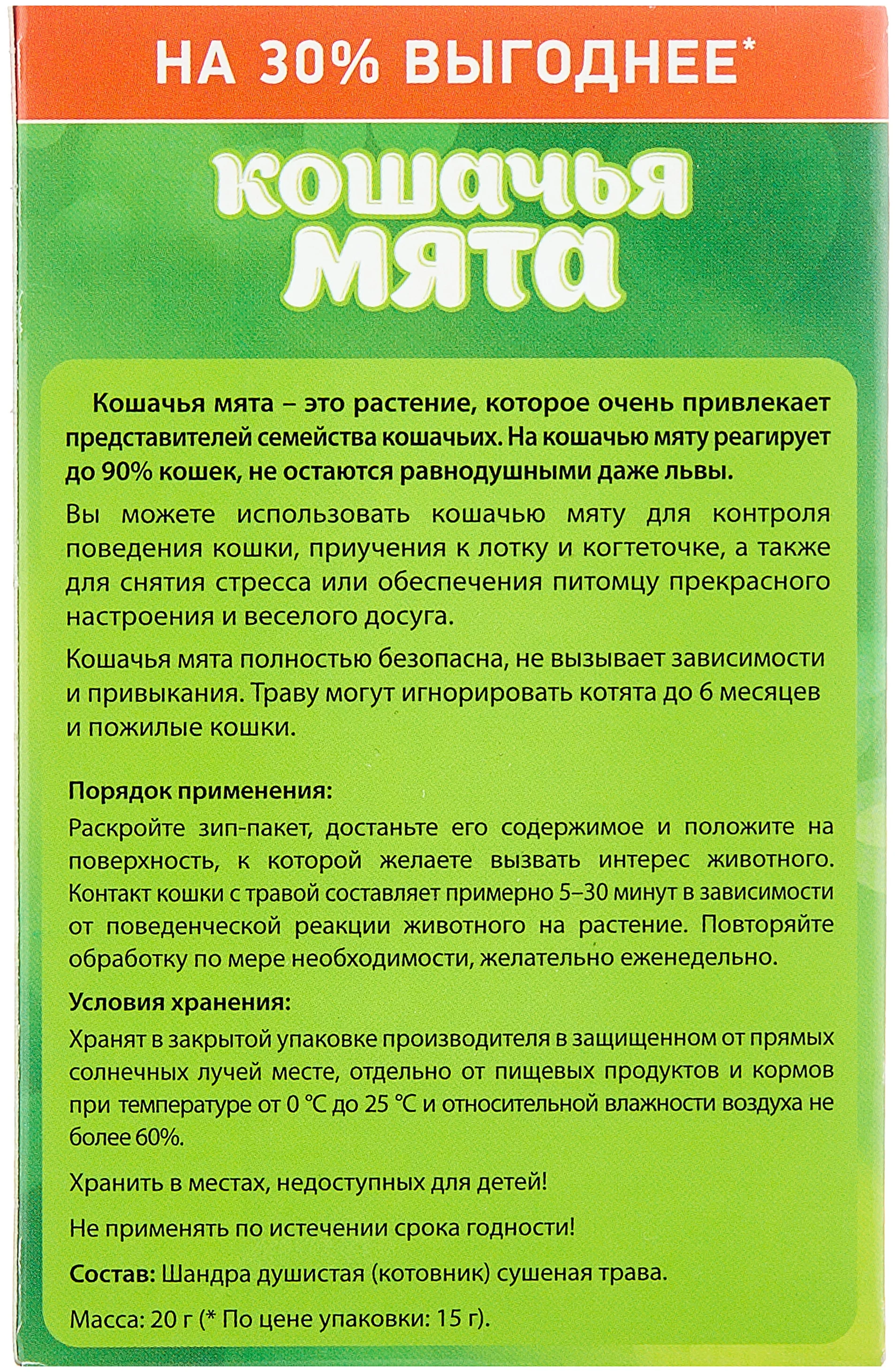 УСЛОВИЯ ХРАНЕНИЯ: Хранят Альпийские Луга Кошачья мята сушеная в закрытой упаковке производителя в защищенном от влаги и прямых солнечных лучей месте, отдельно от пищевых продуктов и кормов при температуре от 0 °С до 30 °С.