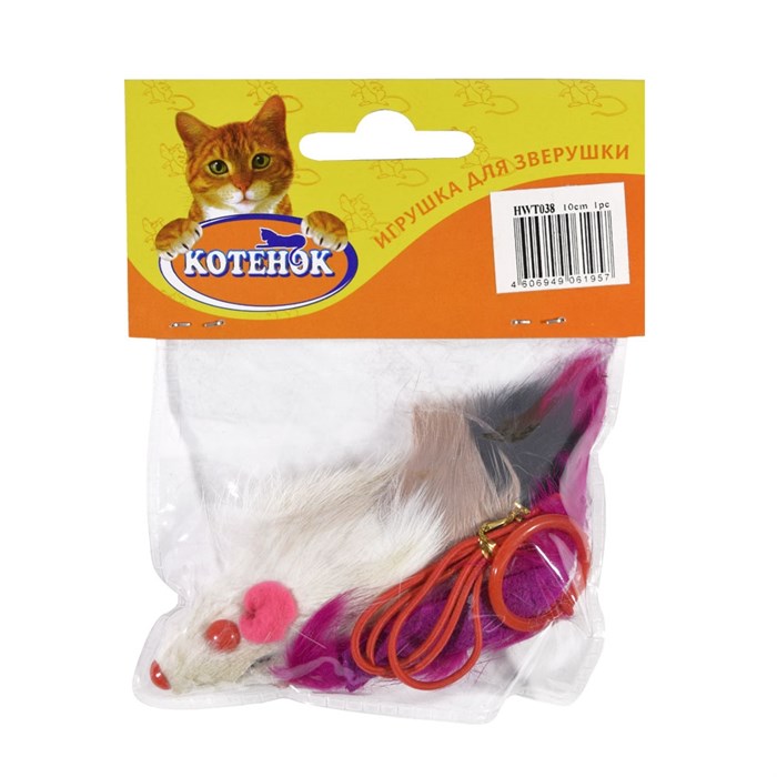 Игрушка Котенок мех Мышь, длинный мех, трехцветная с пищалкой на резинке 10 см
