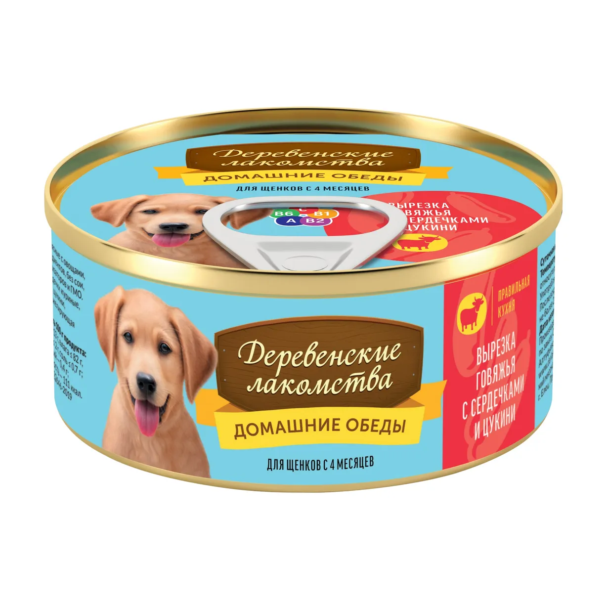 Деревенские лакомства 100 г домашние обеды для щенков вырезка говяжья с сердечками и цукини консервы