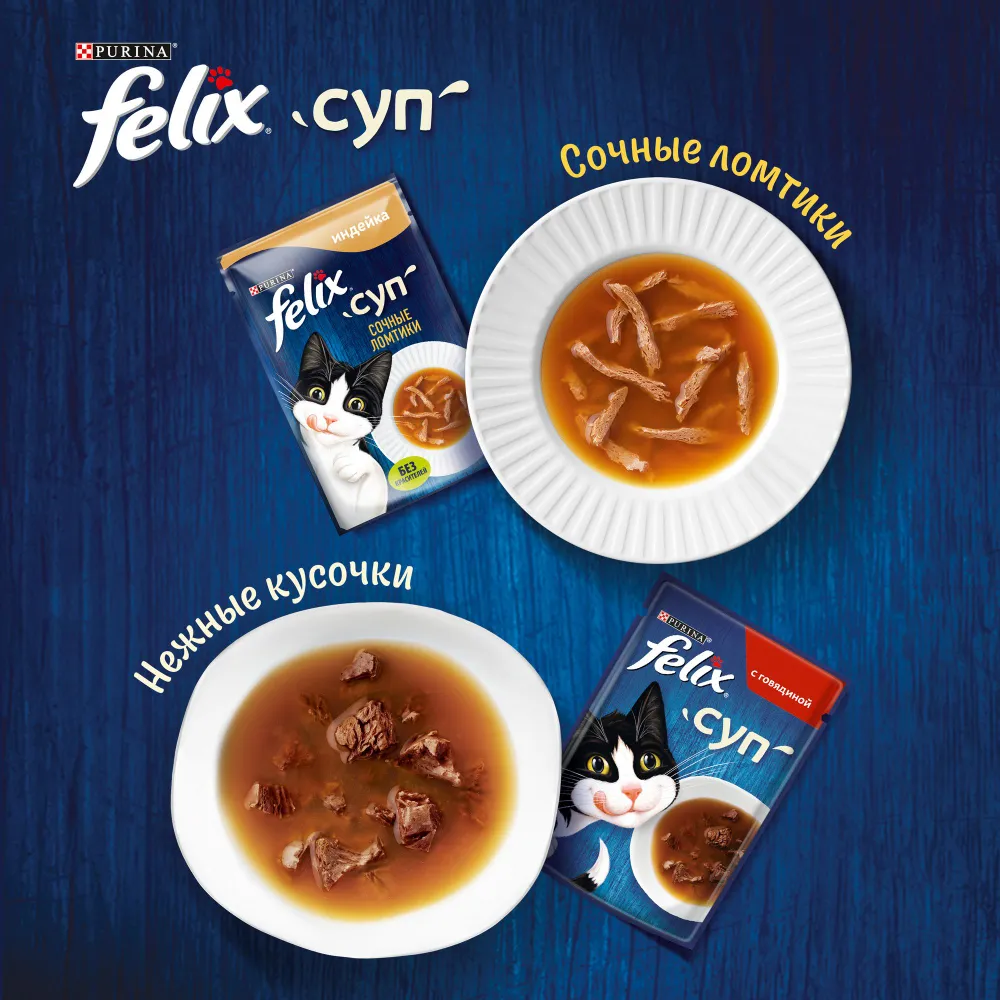 Влажный корм для кошек Felix Суп Сочные ломтики доставит удовольствие вашему питомцу! Для кошек корм в виде аппетитных кусочков в нежном бульоне обладает неповторимым вкусом индейки, даже самый привередливый питомец не останется равнодушным! Феликс Суп Сочные Ломтики — вкусное дополнение к ежедневному рациону, которое внесет разнообразие в питание Вашего любителя вкуснятины! Он по достоинству оценит нежные тонко нарезанные ломтики в большом количестве ароматного бульона! Кошачий корм подходит для взрослых кошек, содержит питательные вещества для поддержания пищеварительной системы, позволяет правильно работать организму. Кошачий корм состоит из: мясо и мясные ингредиенты (включая индейку), экстракты растительного белка, аминокислоты, загустители, рыба и продукты ее переработки, минеральные вещества, продукты переработки растительного сырья, сахара, дрожжи. Для кошки весом 4 кг рекомендуется давать один пакетик супа в день в дополнение к основному рациону. Ради сохранения здорового веса Вашей кошки, пожалуйста, соблюдайте данные рекомендации по кормлению. Подавайте корм комнатной температуры. Следите, чтобы у Вашей кошки всегда была чистая, свежая питьевая вода. Данный продукт является дополнительным в рационе Вашей кошки и содержит много жидкости, чтобы покрывать часть дневной нормы потребления воды Вашей кошкой. Корм для кошек влажный не содержит искусственных красителей и консервантов, поэтому абсолютно безопасен! Благодаря влажному корму для кошек Felix Суп Сочные ломтики ваша кошка будет здорова, энергична, бодра, а главное — сыта!