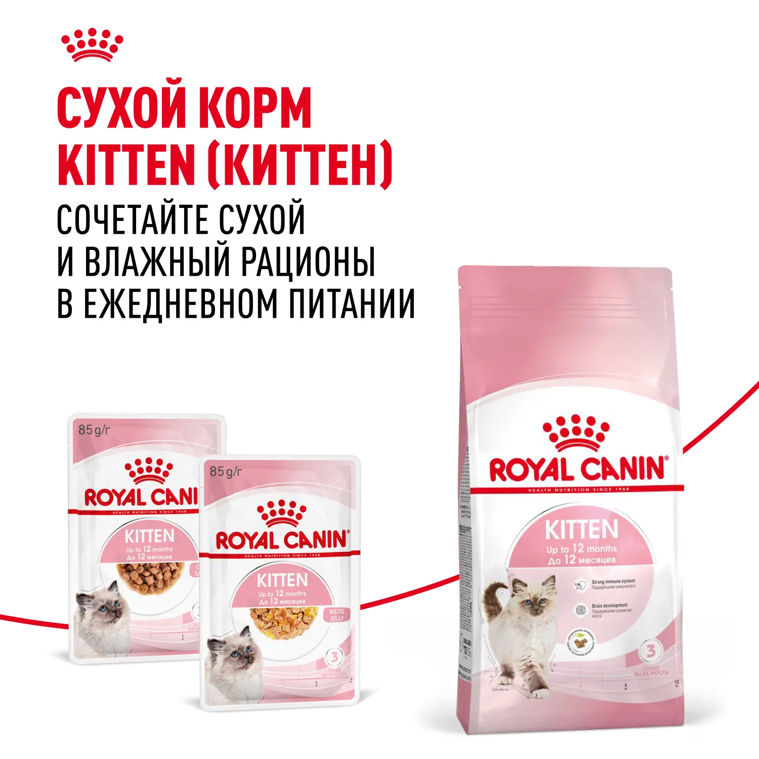 Киттен: влажный корм для котят в возрасте до 12 месяцев. В возрасте от 4 до 12 месяцев скелет котенка продолжает активно расти. Его потребности в энергии еще довольно высоки, но уже начинают постепенно снижаться. Продукт KITTEN в желе для котят от 4 до 12 месяцев также оптимально подходит для кошек в период беременности.