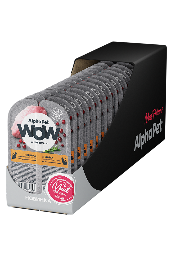 AlphaPet WOW - линейка качественного питания по доступной цене для животных, владельцы которых хотят быть уверены в выборе лучшего качества рациона по разумной цене. Максимально открытый и понятный состав кормов, приготовленных по инновационной технологии из свежего мяса и с содержанием более чем 90% мясного белка!