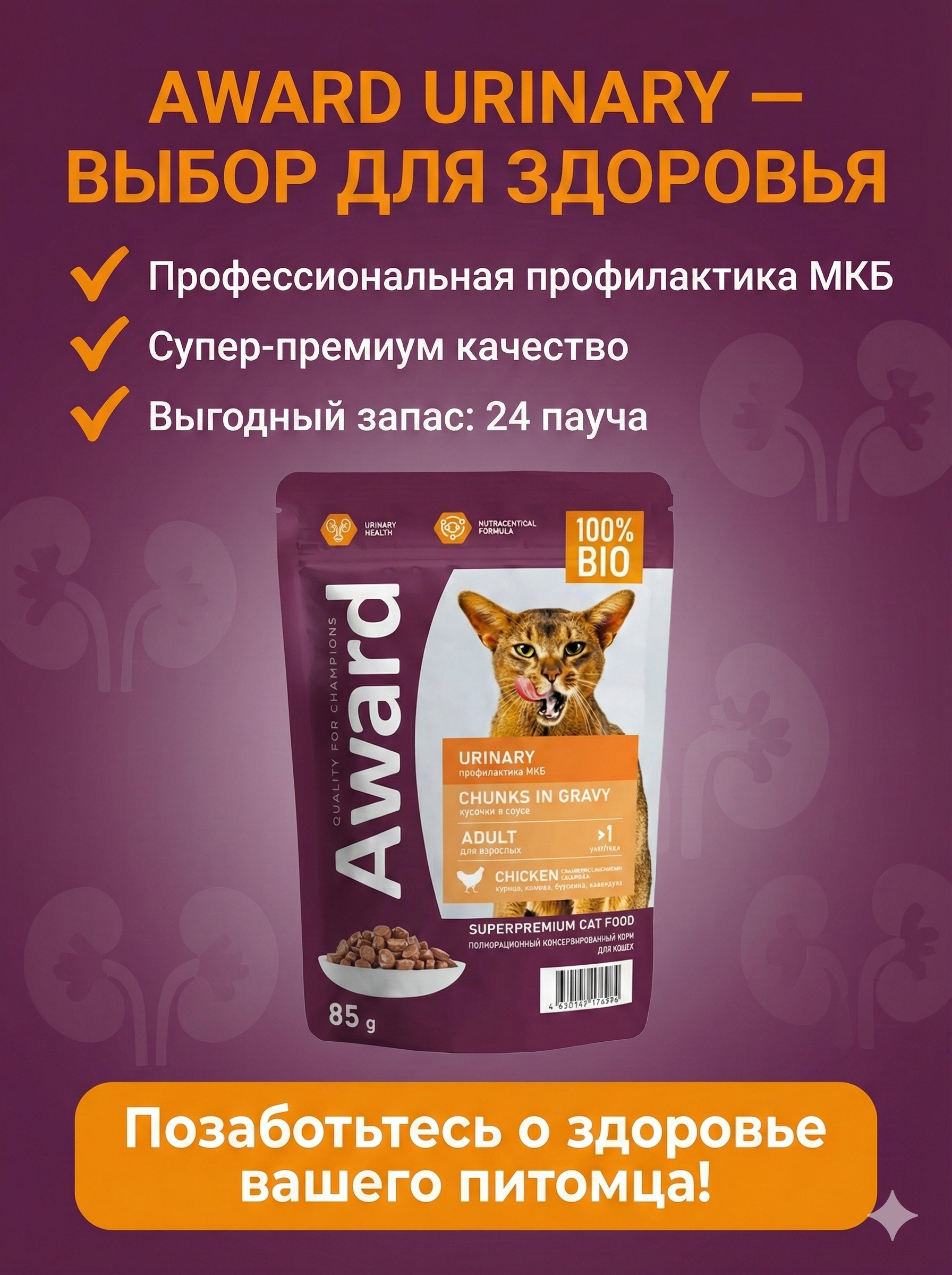 Влажный корм AWARD Urinary для проф. мочекаменной болезни у кошек кусочки в соусе с курицей 24х85г