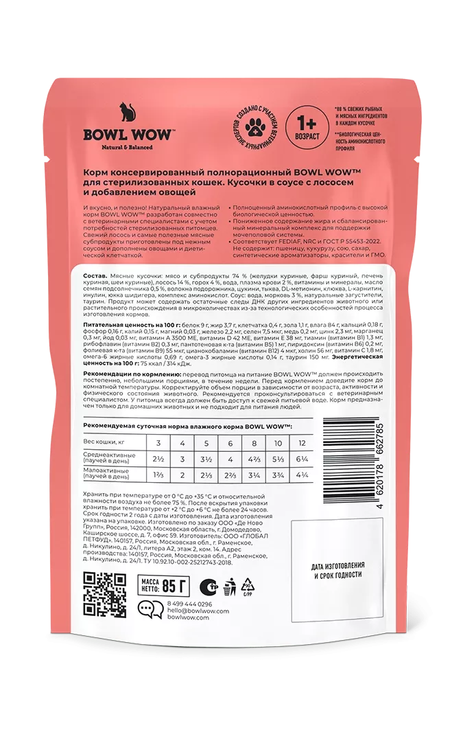 Влажный корм BOWL WOW для стерилизованных кошек с лососем и овощами, кусочки в соусе 85 г
