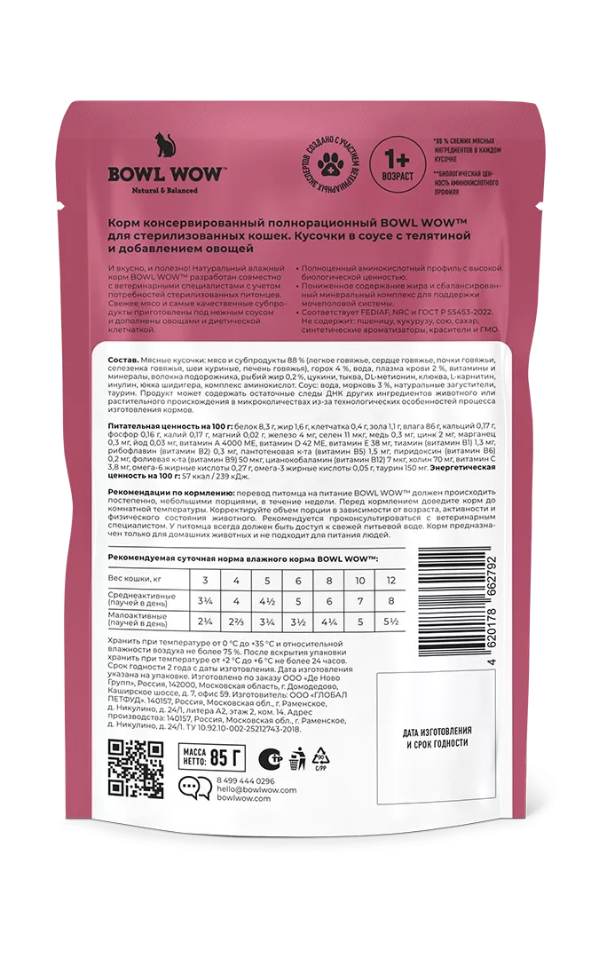Влажный корм BOWL WOW для стерилизованных кошек с телятиной и овощами, кусочки в соусе 85 г