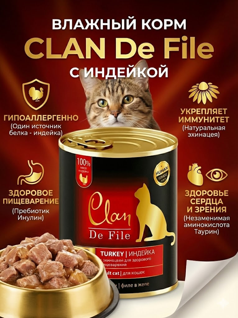 Влажный корм CLAN De File консервы для кошек, индейка, 340 г