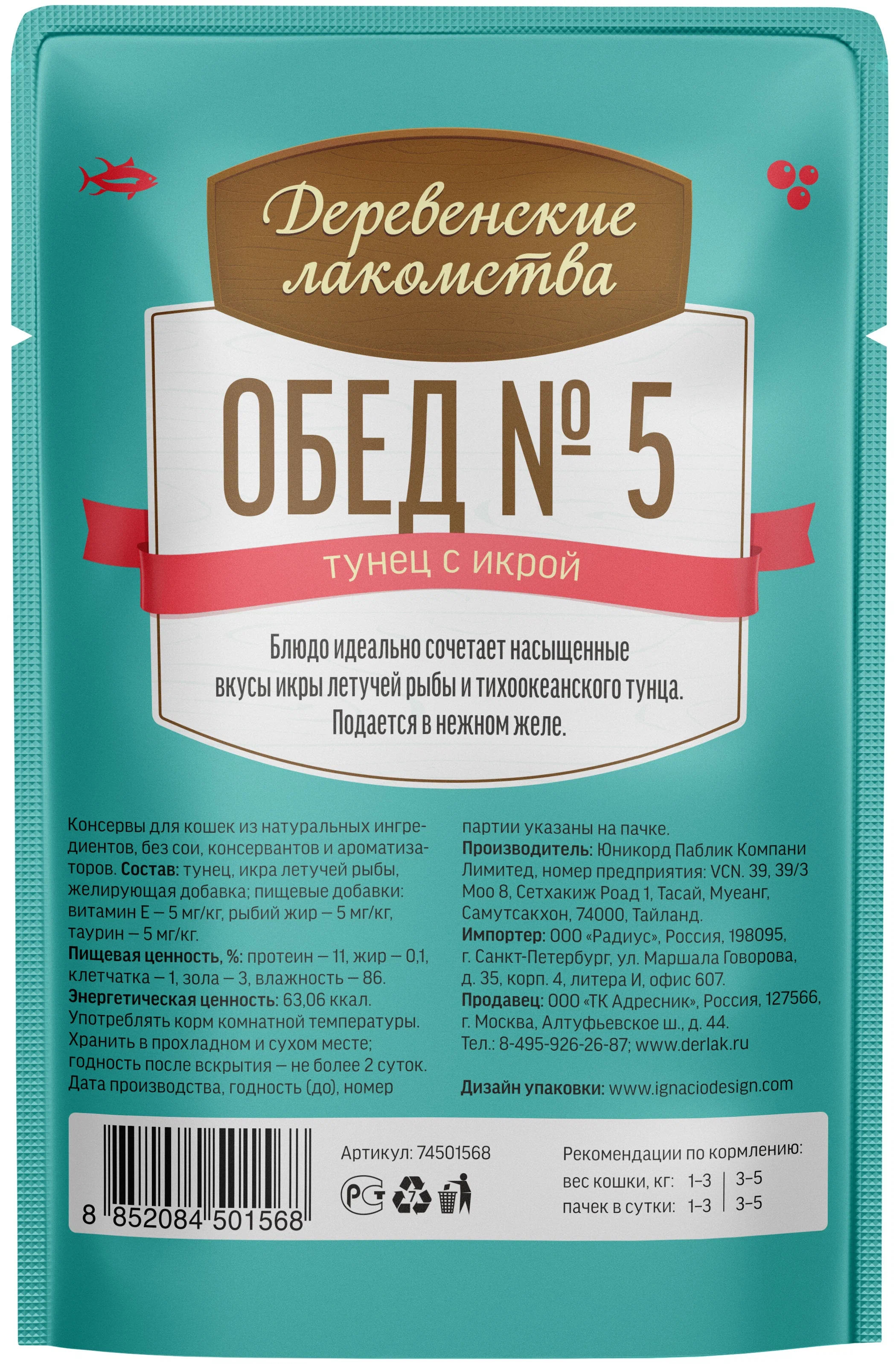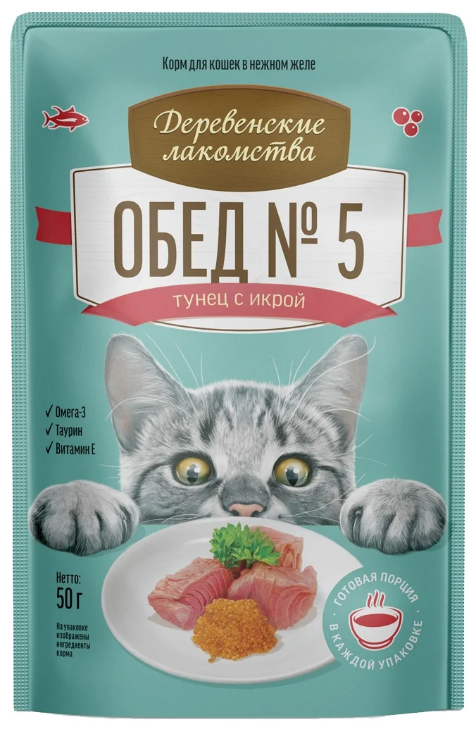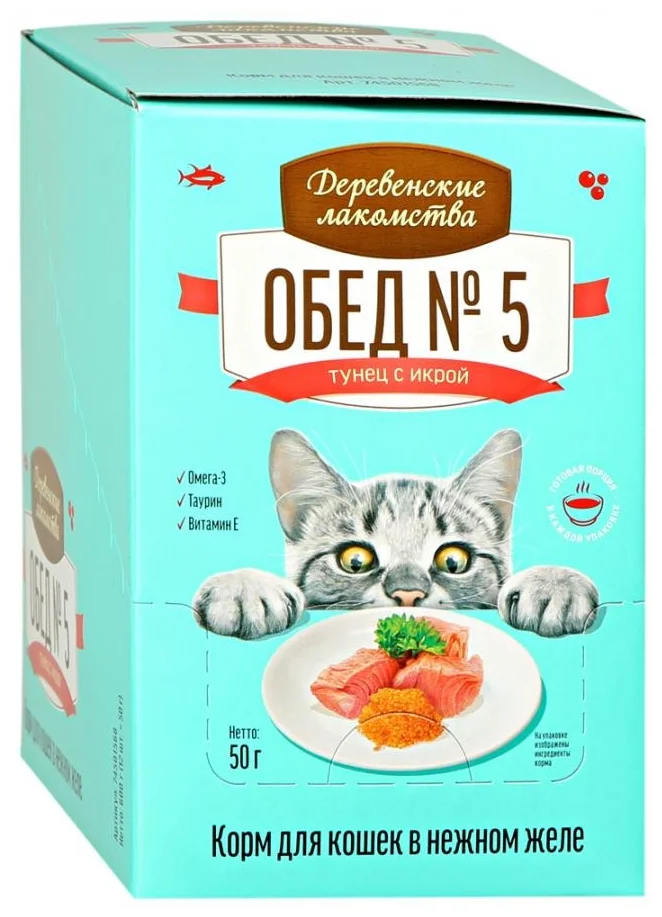 Влажный корм Деревенсие лакомства Обед №5 для кошек тунец с икрой в нежном желе 12*50г.