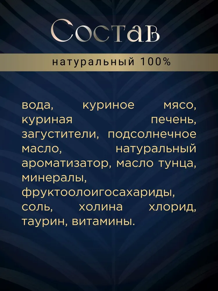 вода, куриное мясо, куриная печень, загустители, подсолнечное масло, натуральный ароматизатор, масло тунца, минералы, фруктоолоигосахариды, соль, холина хлорид, таурин, витамины.