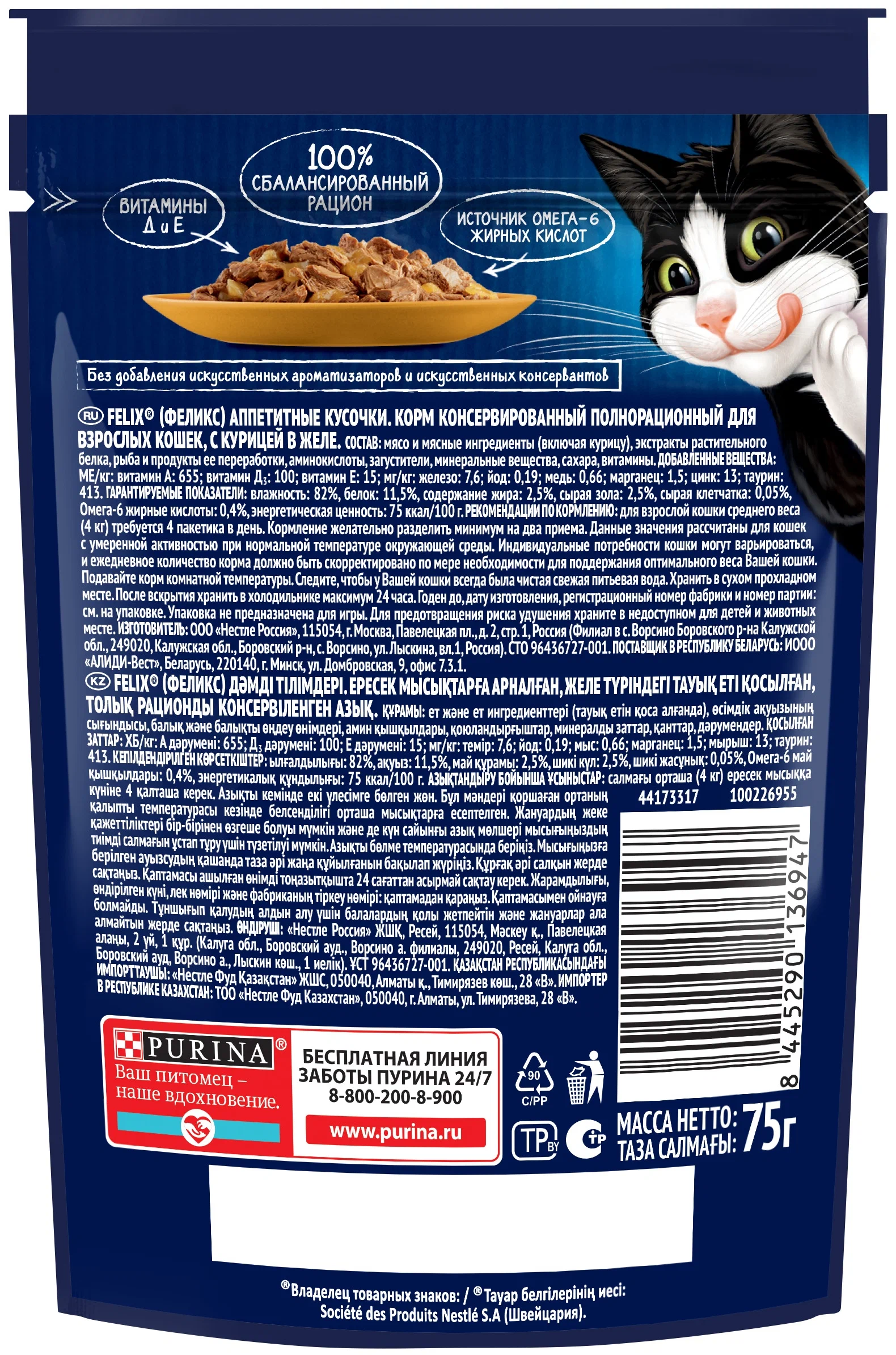 Эксперты Purina, разрабатывая влажные корма для домашних любимцев, создали корм для взрослых кошек Felix «Аппетитные кусочки» — специально для Вашего любителя вкуснятины. Влажный корм для кошек Felix Аппетитные кусочки — полнорационный, содержит все необходимое для здоровой активной долгой жизни.
