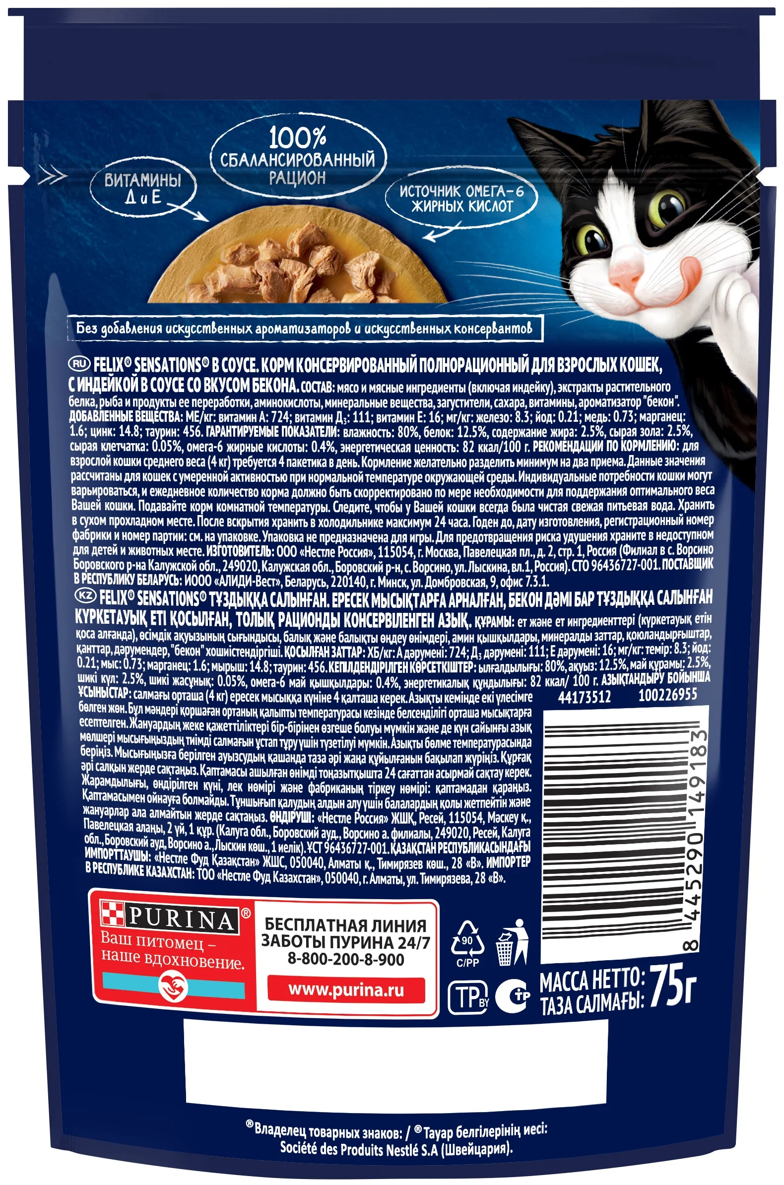 Ингредиенты: мясо и мясные ингредиенты (включая индейку), экстракты растительного белка, рыба и продукты ее переработки, аминокислоты, минеральные вещества, загустители, сахара, витамины, ароматизатор "бекон".