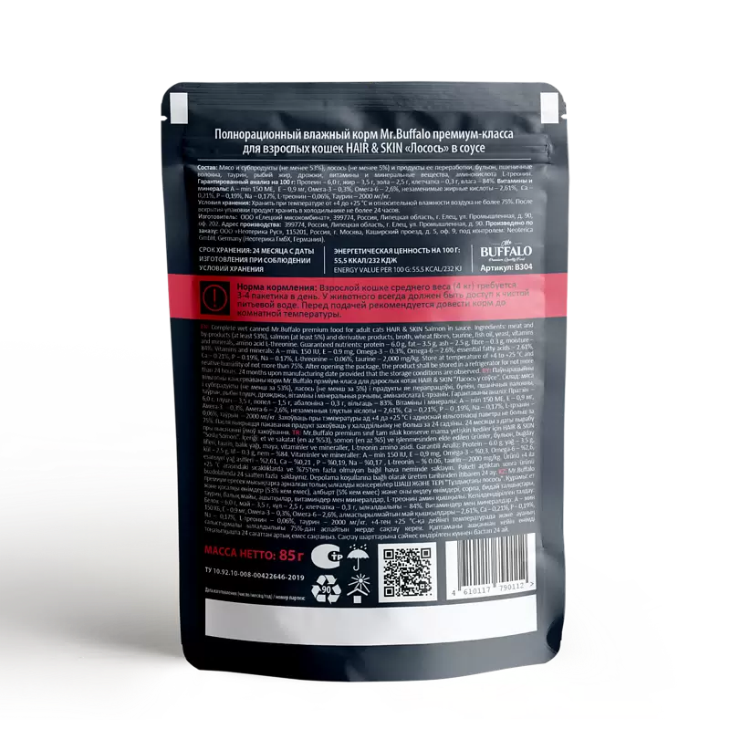 Влажный корм Mr.Buffalo (Баффало) для кошек с чувствительной кожей Лосось в соусе 28*85г