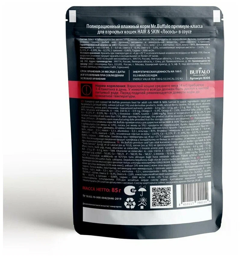 Таурин - важный ингредиент для поддержания остроты зрения и здоровья сердечно-сосудистой системы кошек. Влажный корм Mr.Buffalo не содержит сахара, ГМО, сои. Паучи отлично дополнят полнорационный сухой корм Mr.Buffalo и внесут разнообразие в питание вашей кошки.