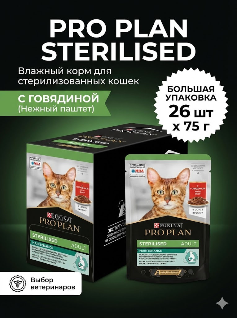 Влажный корм PRO PLAN для стерилизованных кошек Говядина, паштет 26X75г