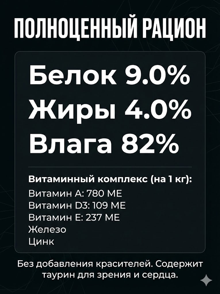 Полноценное питание: Обогащён необходимыми витаминами, минералами и таурином для здоровья сердца, зрения и общего тонуса.