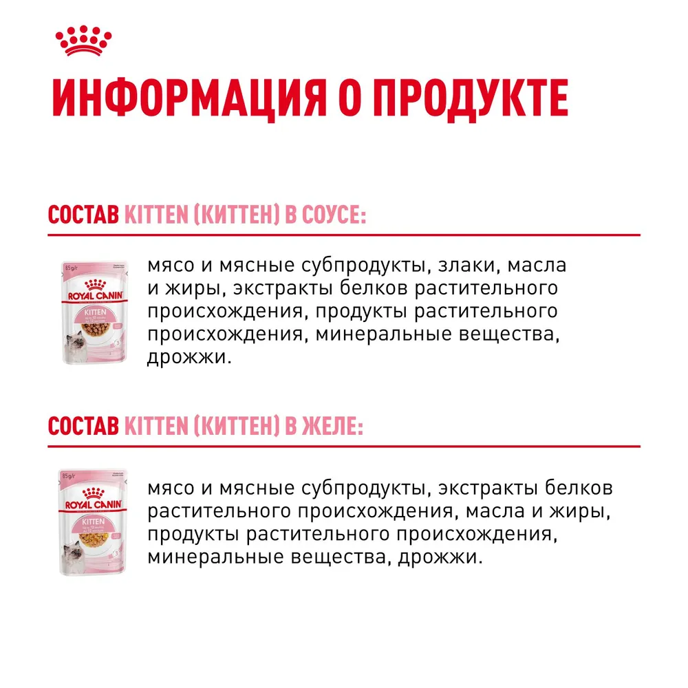 Киттен: влажный корм в текстуре кусочки в желе (5шт) и кусочки в соусе (5шт) для котят в возрасте до 12 месяцев, а также также оптимально подходит для кошек в период беременности и лактации.