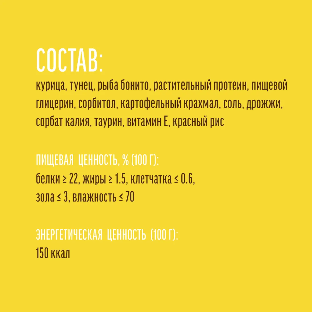 Состав: курица, тунец, рыба бонито, растительный протеин, пищевой глицерин, сорбитол, картофельный крахмал, соль, дрожжи, сорбат калия, таурин, витамин E, красный рис.
