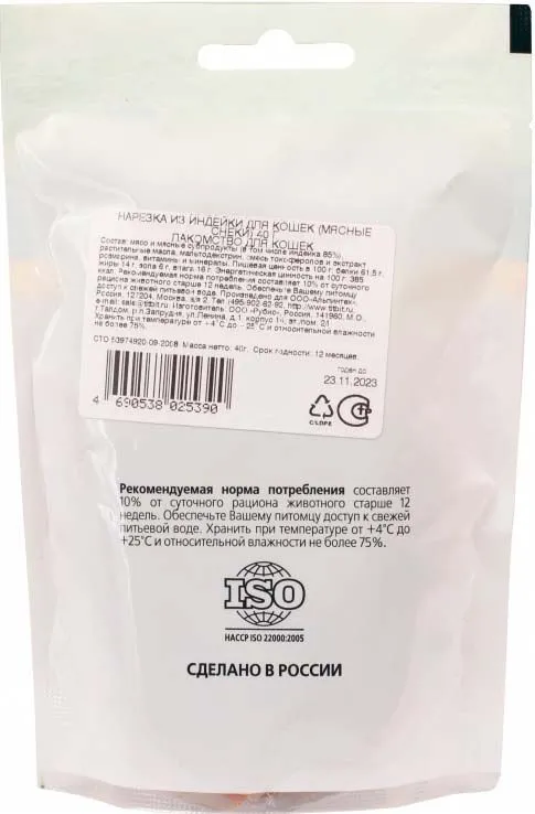 Лакомство Титбит для кошек Мягкие снеки Нарезка из индейки 40г