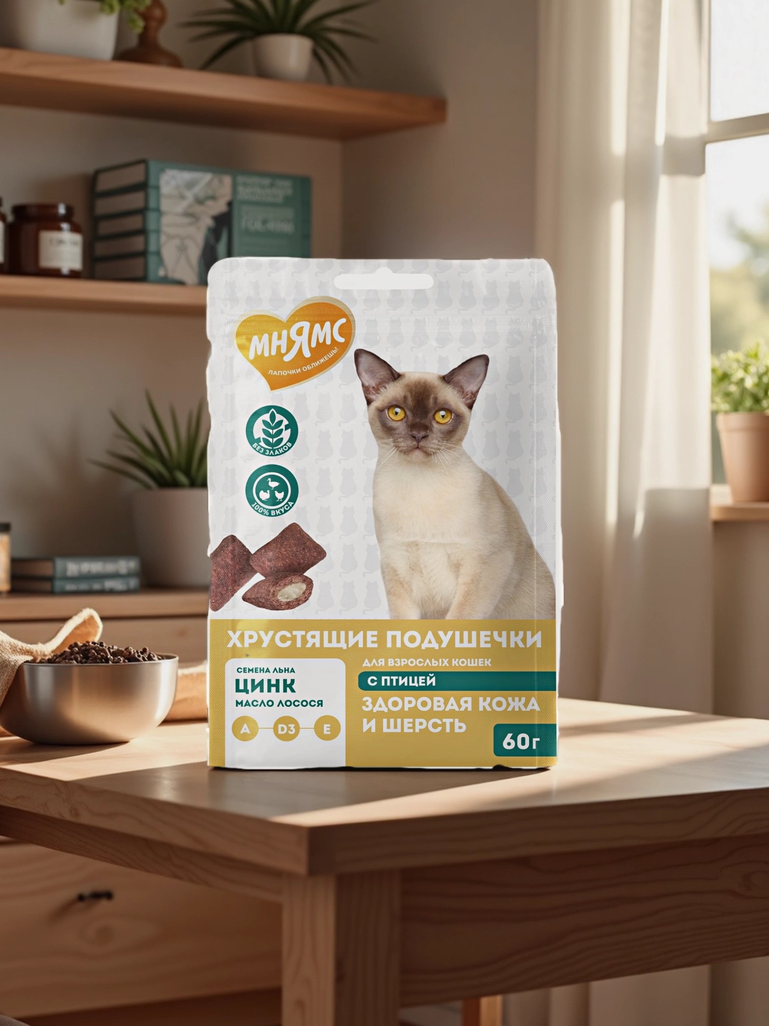 Лакомство Мнямс "Здоровая кожа и шерсть" хрустящие подушечки для кошек с птицей 60 г.