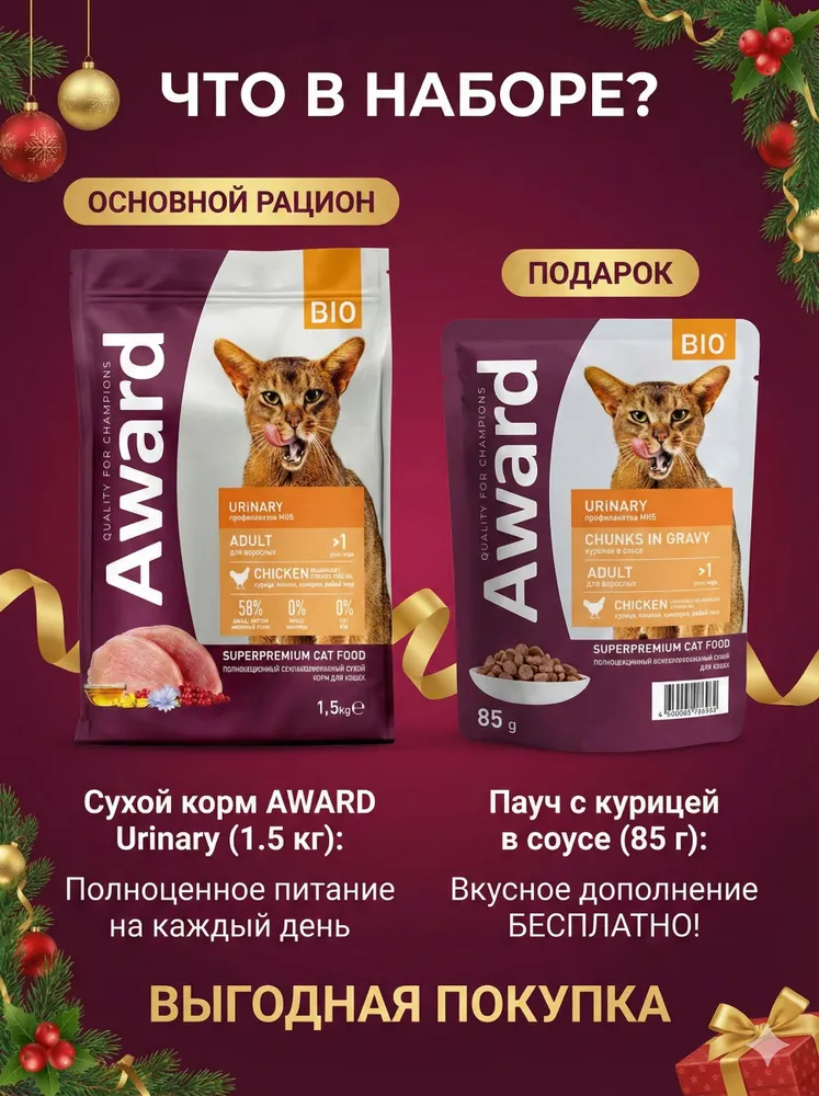 Новогодний набор для кошек Сухой корм AWARD Urinary с курицей, 1,5кг + пауч Urinary с куриц. в соусе