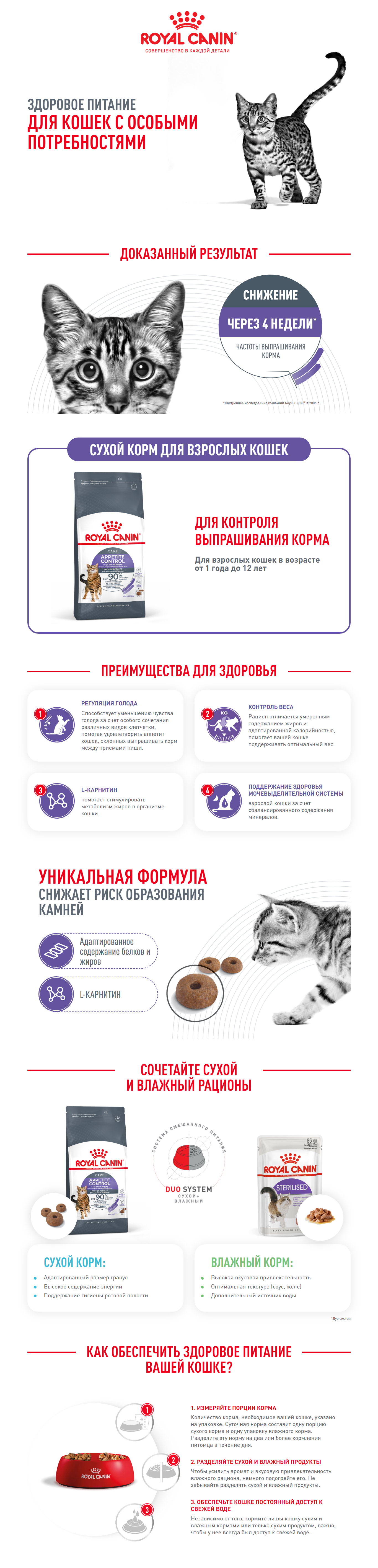 1. Контролируйте частоту выпрашивания корма и поддерживайте оптимальный вес вашей кошки с помощью полнорационных сбалансированных продуктов Appetite Control Care.
