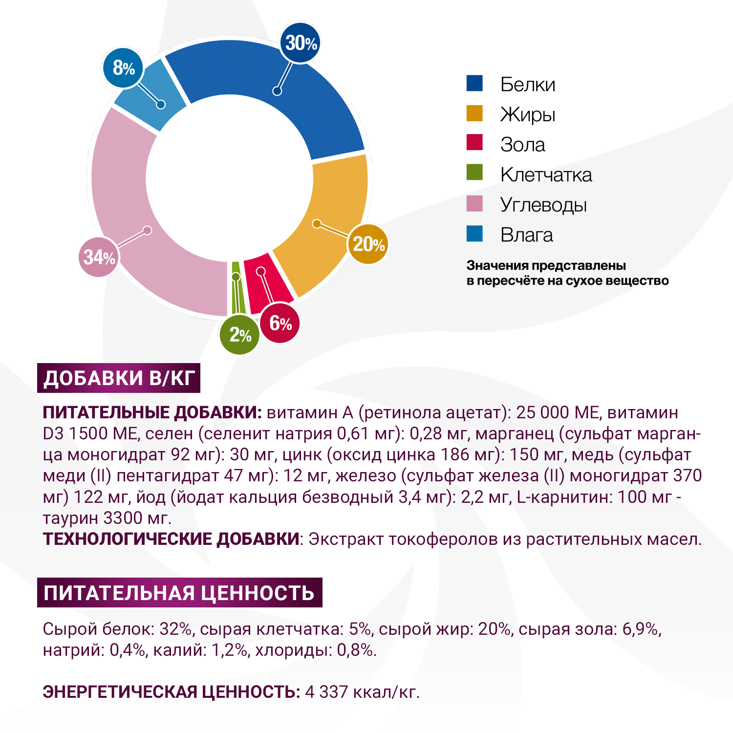 Питательные добавки: витамин А (ретинола ацетат): 25 000 МЕ, витамин D3 1500 МЕ, селен (селенит натрия 0,27 мг): 0,12 мг, марганец (сульфат марганца моногидрат 77 мг): 25 мг, медь (сульфат меди (II) пентагидрат 39 мг): 10 мг, железо (сульфат железа (II) моногидрат 249 мг) 82 мг, йод (йодат кальция безводный 7.3 мг): 4.8 мг, L-карнитин: 100 мг, таурин 2 500 мг.