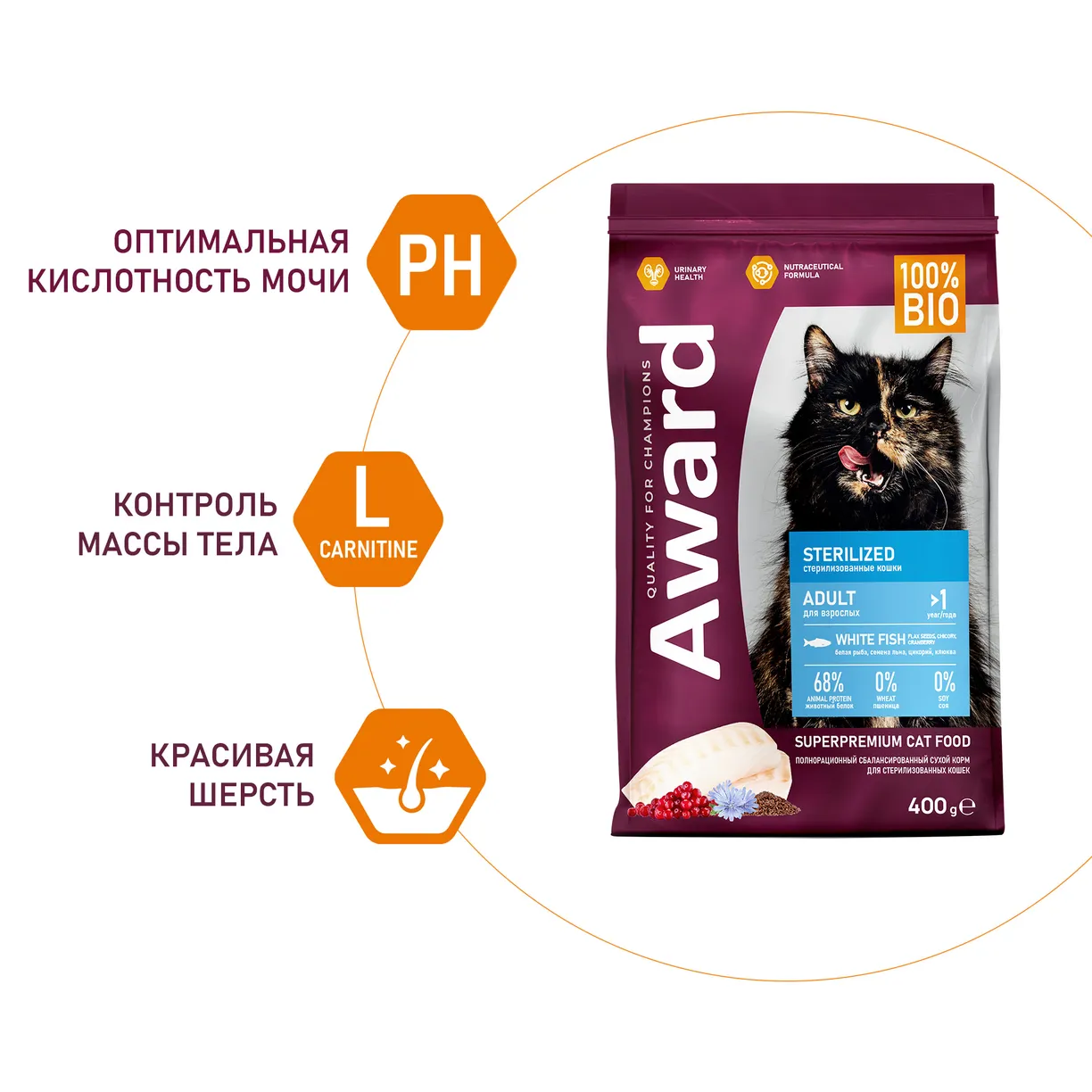 Сухой корм AWARD Sterilized для стерилизованных кошек. Белая рыба, семя льна, клюква и цикорий 400гр