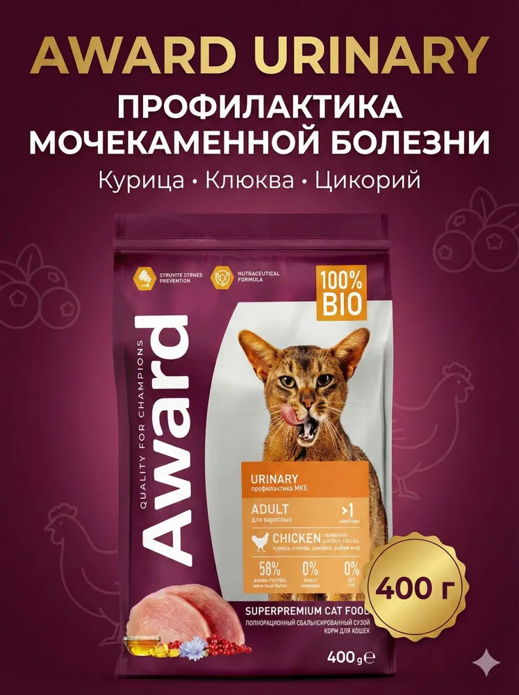 Сухой корм AWARD Urinary для кошек, профилакт. мочекам. болезни с курицей, клюкв, цикор.400г
