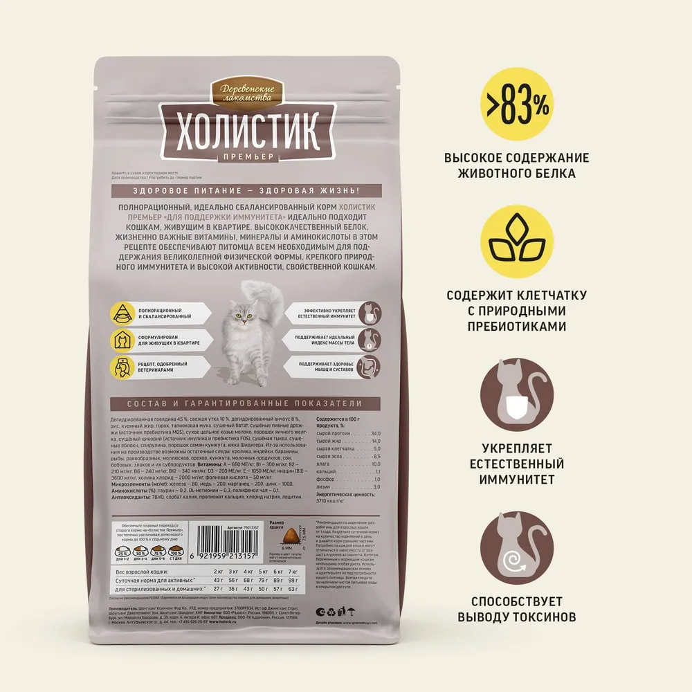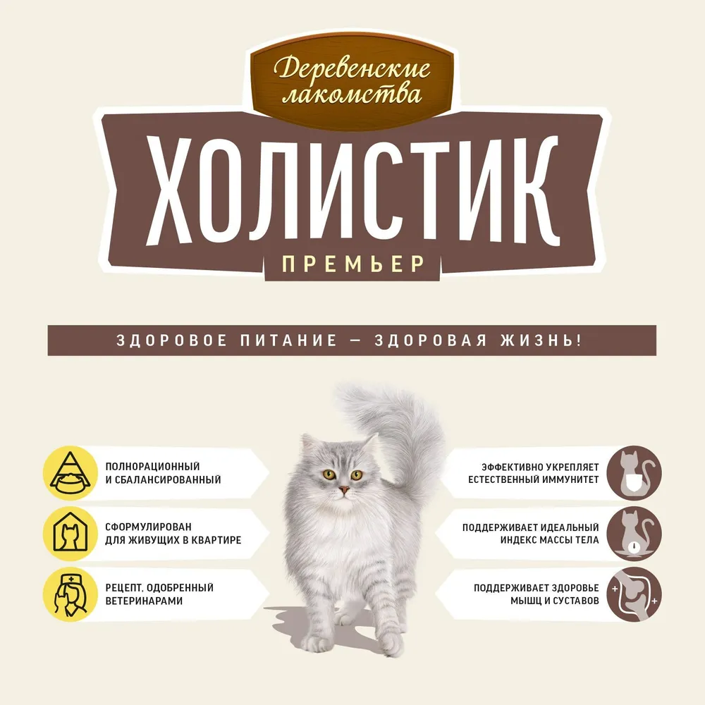 Сбалансированный, натуральный, полнорационный корм «Деревенские лакомства Холистик Премьер» обеспечивает питомцев всем необходимым для поддержания здоровья на каждом этапе жизни. В уникальных рецептах учтены не только вкусовые предпочтения кошек, но и их физиологические особенности, уровень активности и возраст.