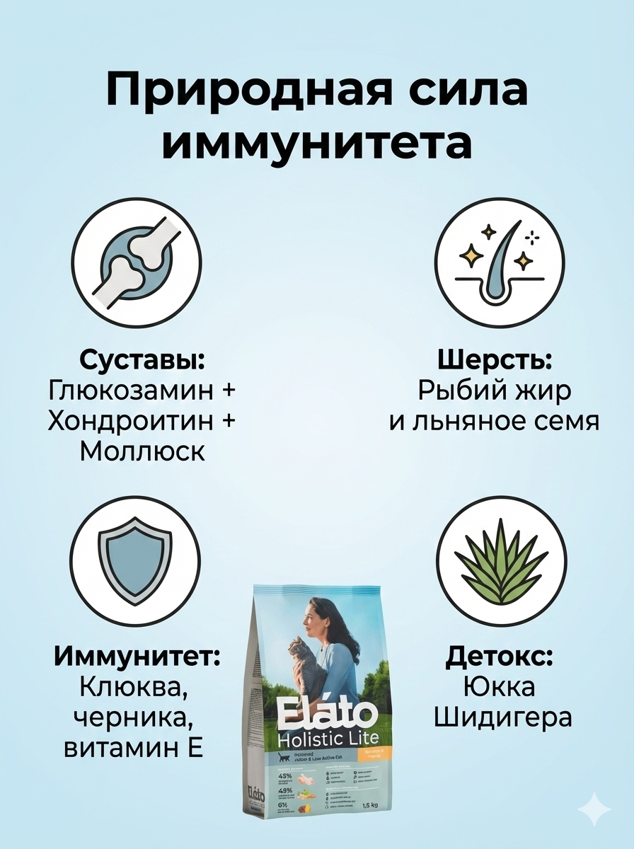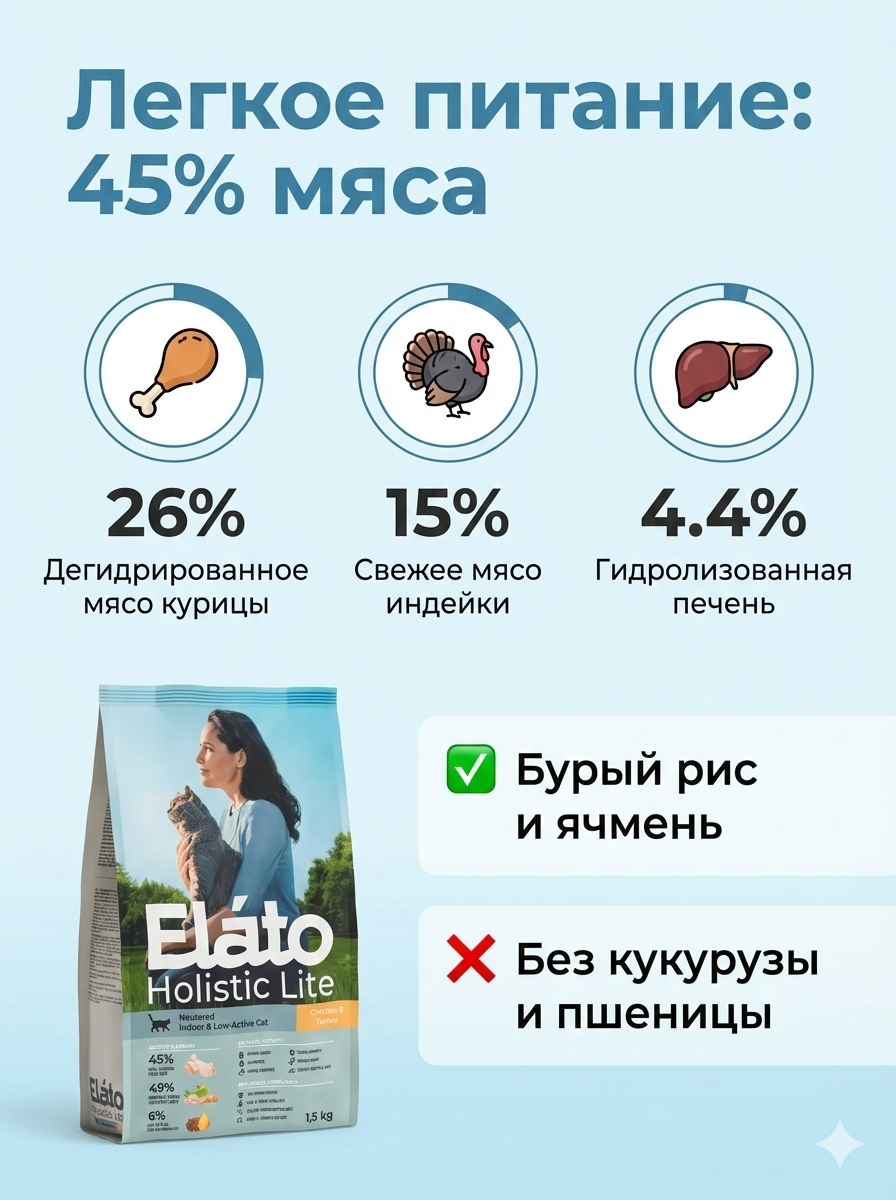 Сухой корм Elato Holistic Lite для стерилизованных кошек, ягненок с индейкой, 1,5 кг