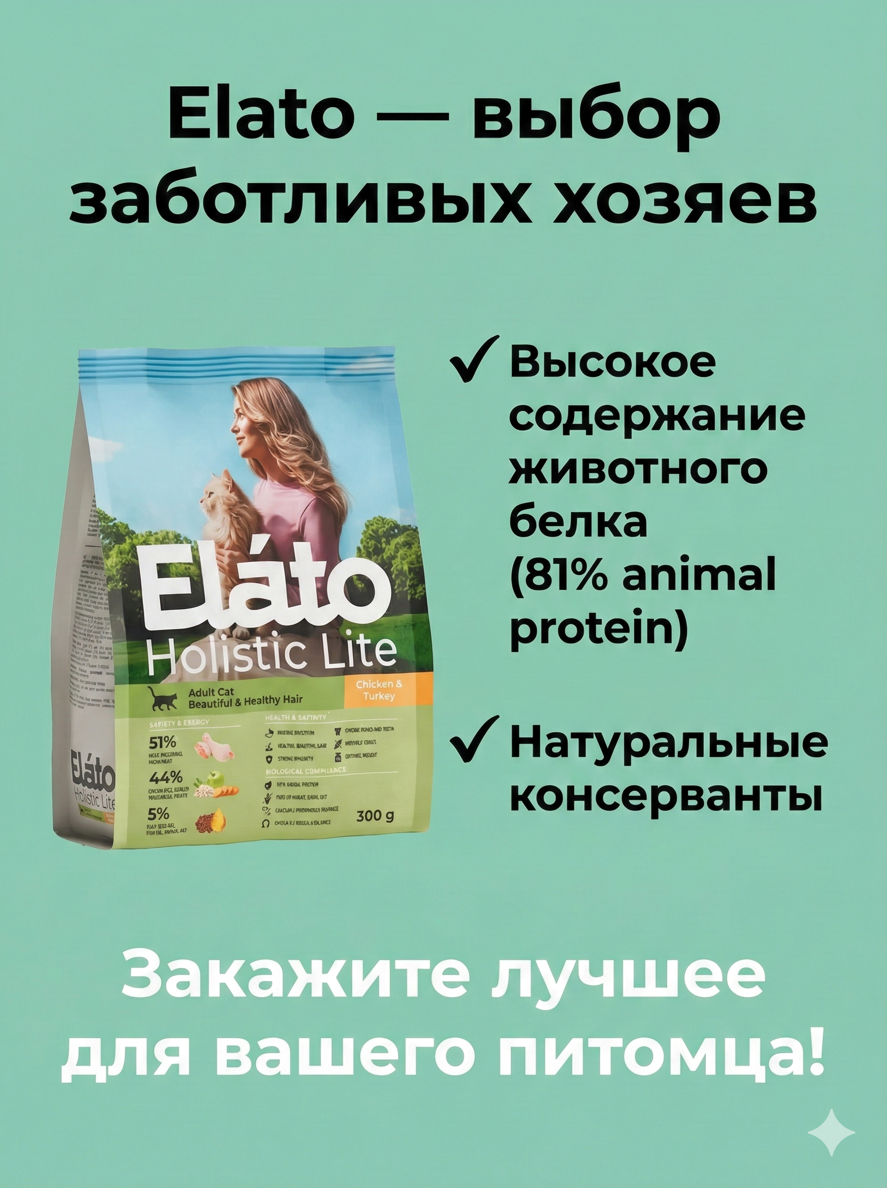 Подарите своей кошке силу природы и отменное здоровье с кормом Elato Holistic Lite! Это полнорационное питание класса холистик, разработанное с участием ветеринарных диетологов.