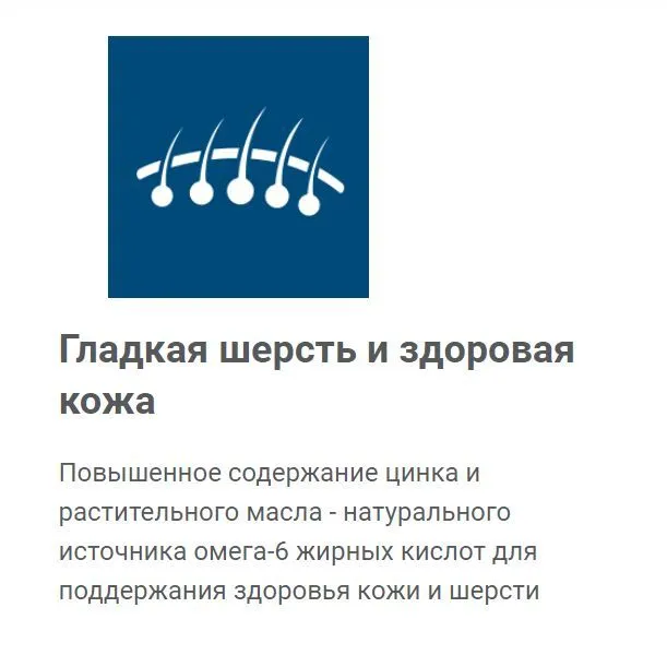 Повышенное содержание цинка и растительного масла - натурального источника омега-6 жирных кислот для поддержания здоровья кожи и шерсти - Способствует уменьшению неприятного запаха