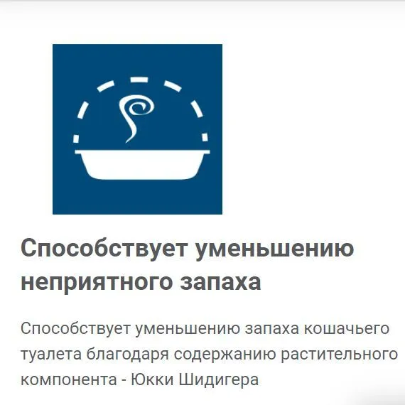 Способствует уменьшению запаха кошачьего туалета благодаря содержанию растительного компонента - Юкки Шидигера