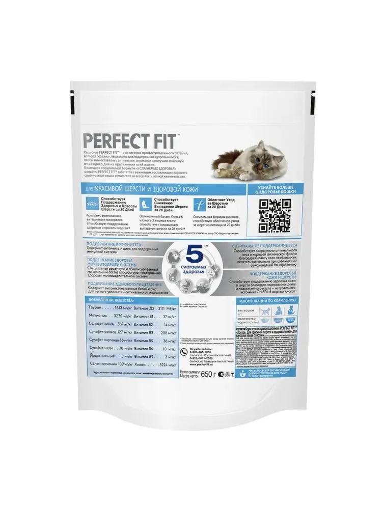 Сухой корм PERFECT FIT для кошек, для красивой шерсти и кожи с лососем, 650г