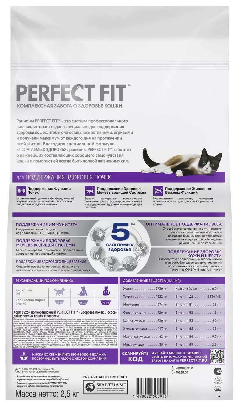 Сухой корм Perfect Fit для взрослых кошек для здоровья почек, с лососем - 2,5 кг