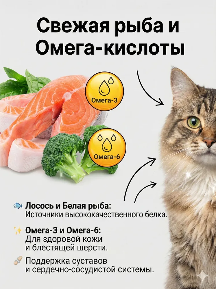- Обогащение омега-3 и витаминами: Лосось и белая рыба обеспечивают блестящую шерсть, а брокколи и пребиотики улучшают пищеварение.