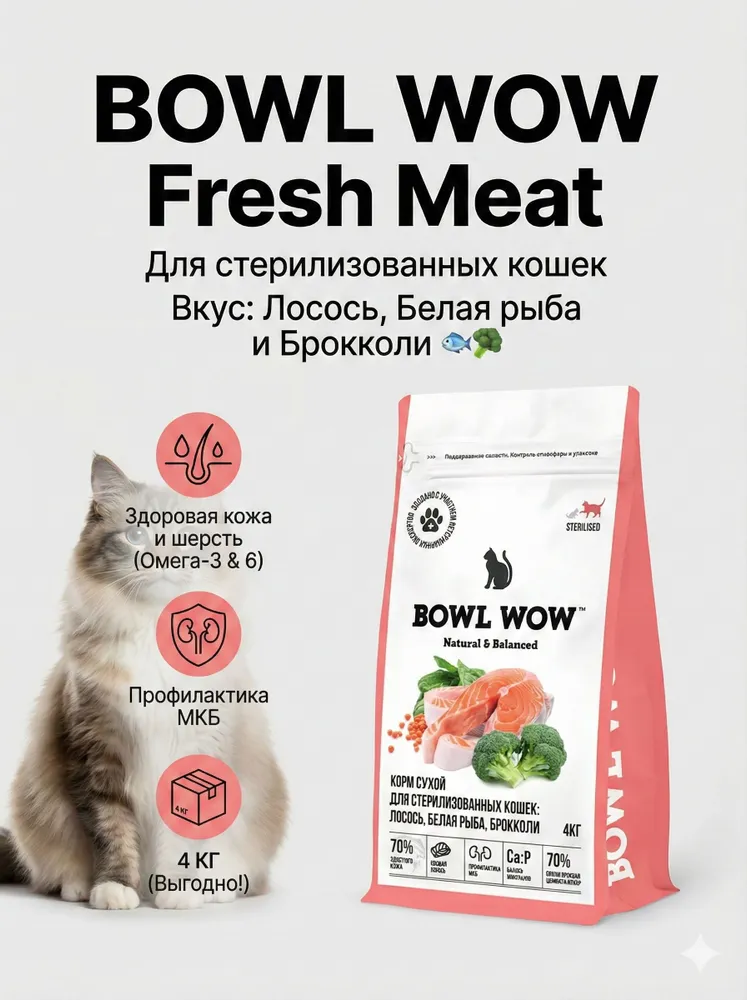 Сухой корм BOWL WOW Fresh Meat для стерилизованных кошек с лососем, белой рыбой и брокколи 4 кг
