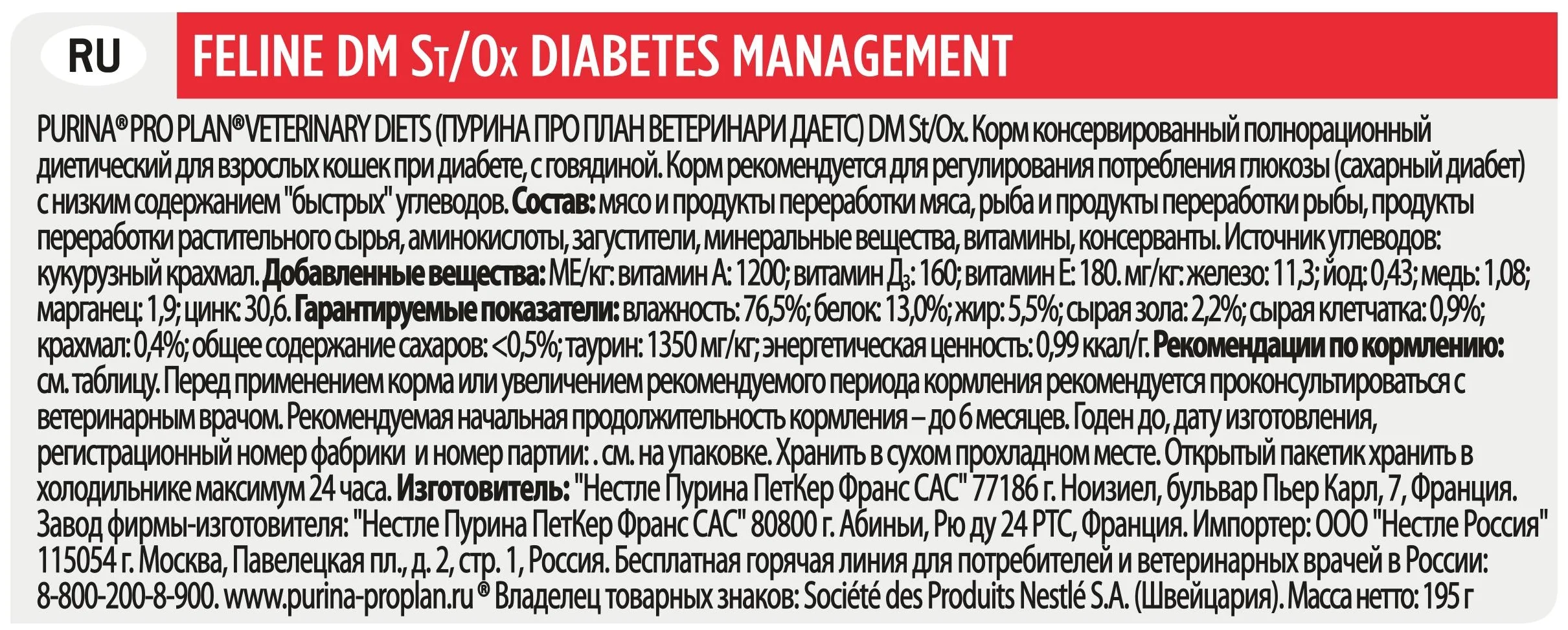 PURINA PRO PLAN VETERINARY DIETS для взрослых кошек DM St/Ox - корм влажный полнорационный диетический при диабете.