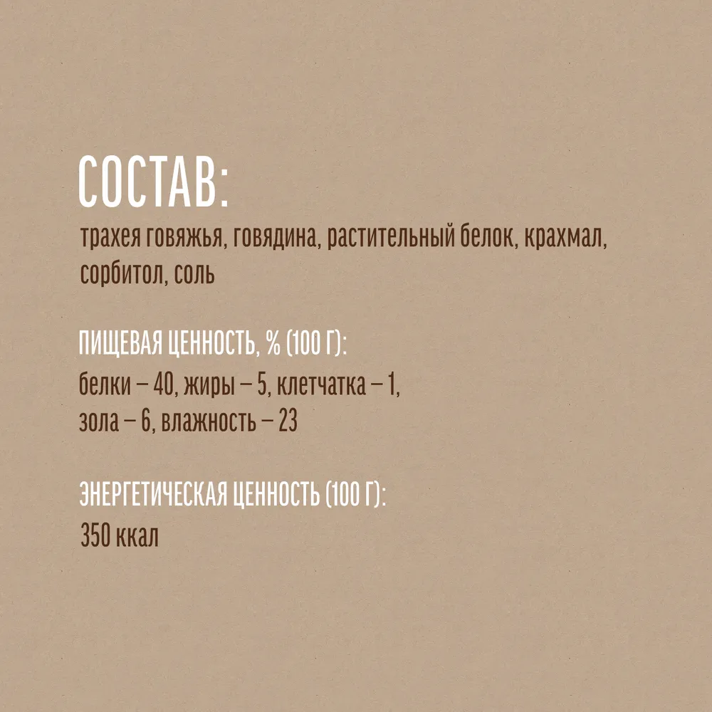 Состав: трахея говяжья, говядина, растительный белок, крахмал, сорбитол, соль.