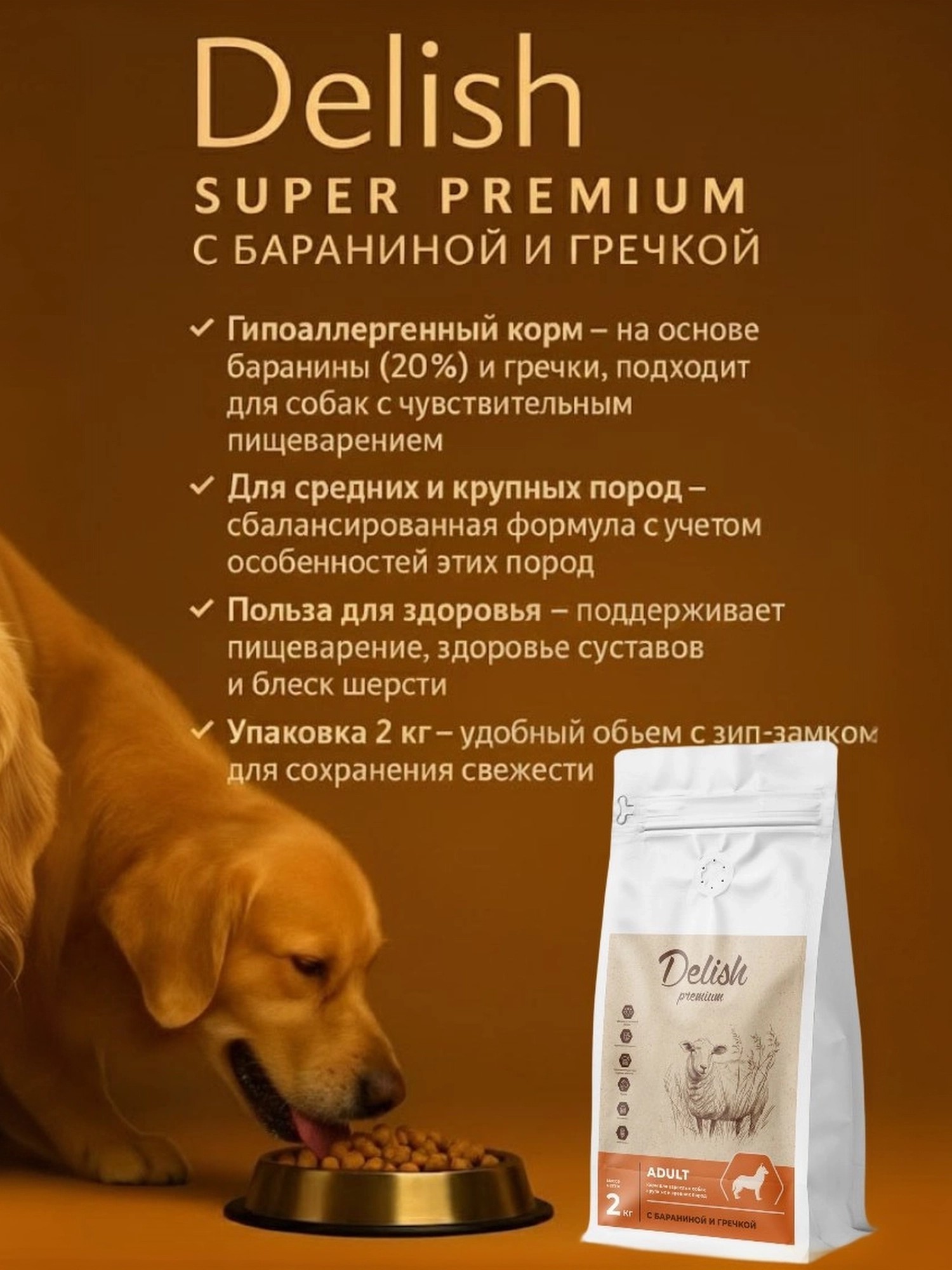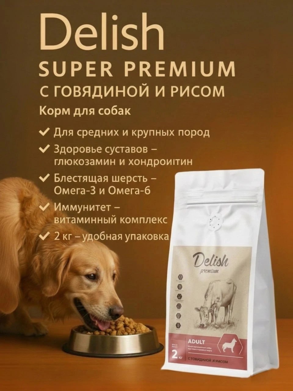 Сухой корм Delish Premium для собак  средних и крупных пород, говядина с рисом, 2кг