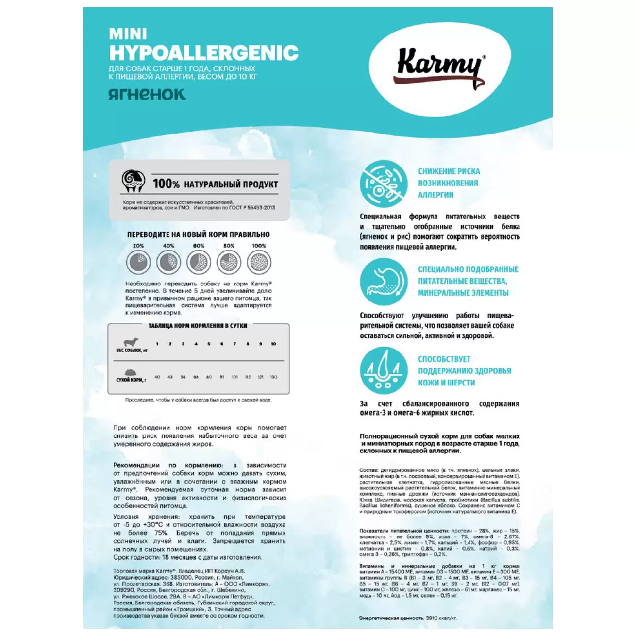 Сухой корм Karmy Hypoallergenic Mini Ягненок создан специально для собак мелких пород старше 1 года. Рецептура корма разработана таким образом, чтобы сократить вероятность появления пищевой аллергии. Тщательно подобранные источники белка, питательные вещества и микроэлементы способствуют укреплению иммунной и пищеварительной системы питомца. Благодаря натуральности ингредиентов и превосходному вкусу корма Karmy Hypoallergenic Mini Ваша собака будет здорова и активна! Показатели питательной ценности: протеин - 28%, жир - 15%, влажность - не более 9%, зола - 7%, омега-6 - 2,67%, клетчатка - 2,5%, лизин - 1,7%, кальций - 1,4%, фосфор - 0,95%, метионин и цистин - 0,8%, калий - 0,6%, натрий - 0,3%, омега 3 - 0,26%, триптофан - 0,2%. Энергетическая ценность: 3910 ккал/кг.