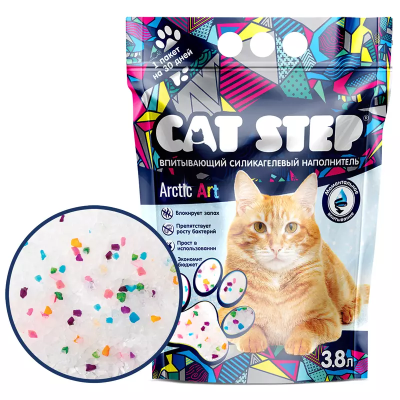 CAT STEP Arctic Art моментально впитывает влагу и уничтожает запахи, препятствует размножению бактерий и грибков за счет своего неорганического происхождения и не требует постоянного контроля и ежедневной уборки кошачьего лотка. Содержимого пакета 3,8 л хватает в среднем на 1 месяц использования.