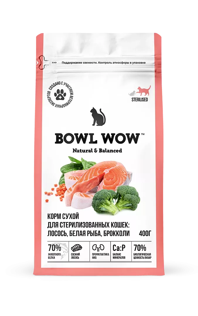 Сухой корм BOWL WOW Fresh Meat для стерилизованных кошек с лососем, белой рыбой и брокколи, 400гр