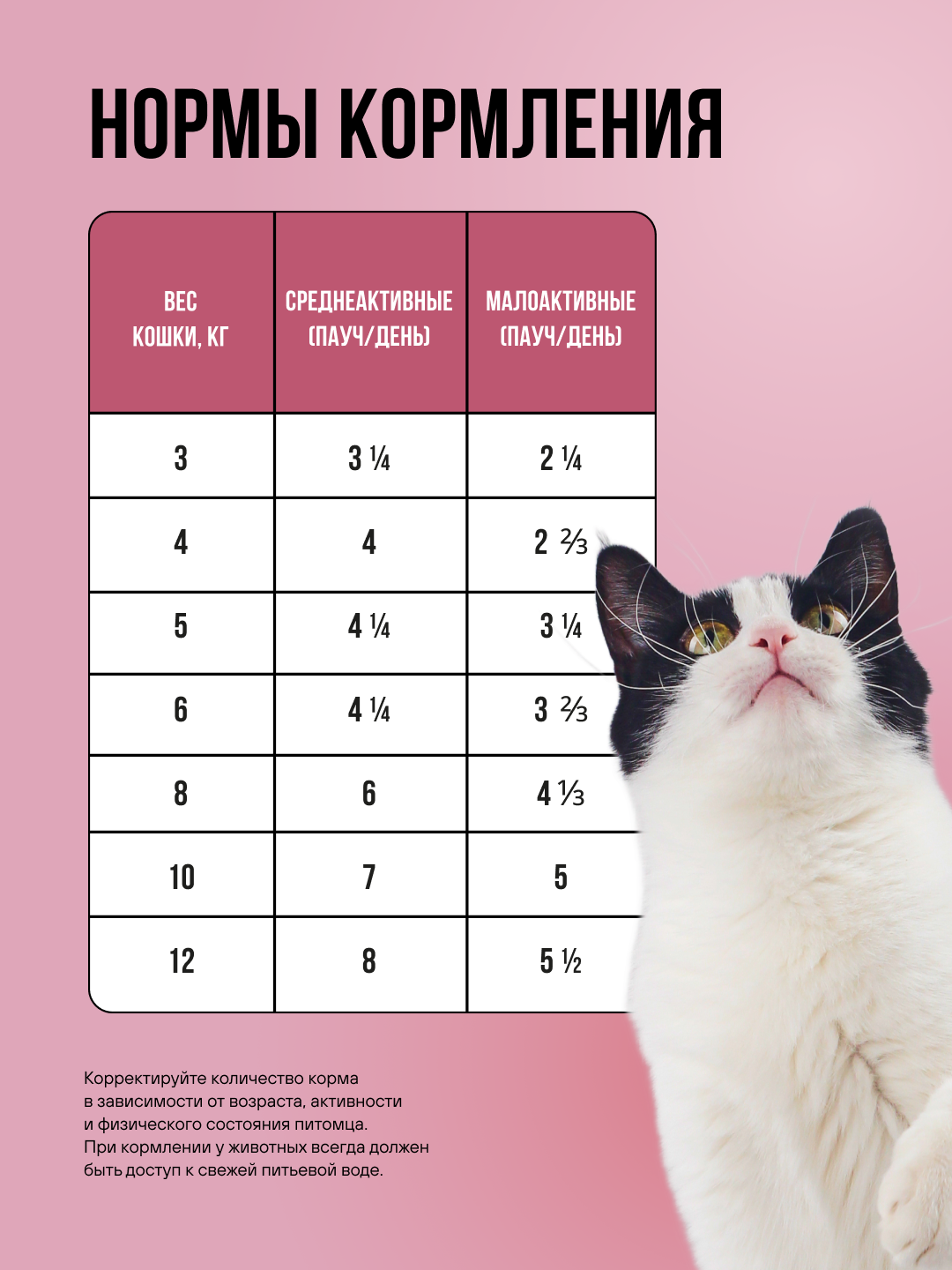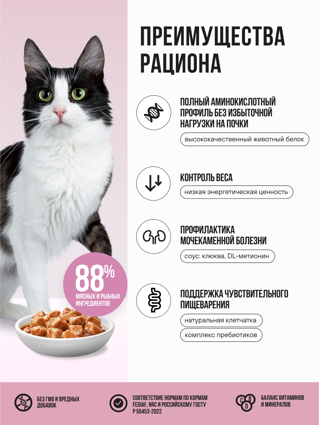 • Высокое содержание мяса и рыбы — 88% животных ингредиентов в каждой порции